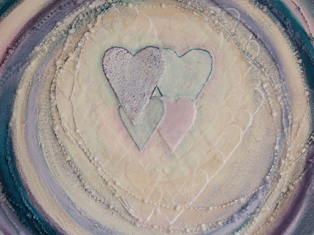 Door het schilderij hebben we het over onze trouwdag en over de mensen die niet meer onder ons zijn. Ze vertegenwoordigen nog wel een hartje op ons schilderij en gaan dus nooit uit ons hart. Het herinnert ons ook aan de drukte om ons heen. In het midden, waar het rustig is, staan wij als gezin. Omringd met liefde. ”