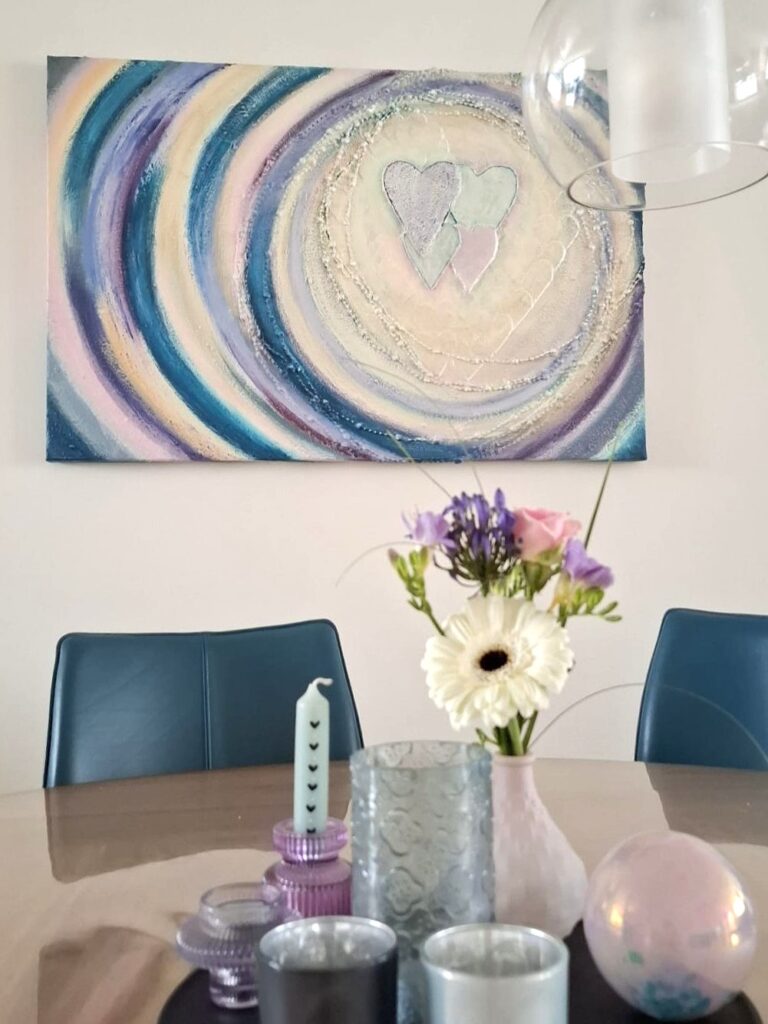 We wilden een schilderij met ronde vormen in de kleuren van onze woonkamer. Het moest het verhaal vertellen van onze liefde, van ons als gezin en van onze prachtige huwelijksdag. Én we wilden een herinnering aan dat niks vanzelfsprekend is en dat je mag genieten van de kleine, mooie dingen in het leven.