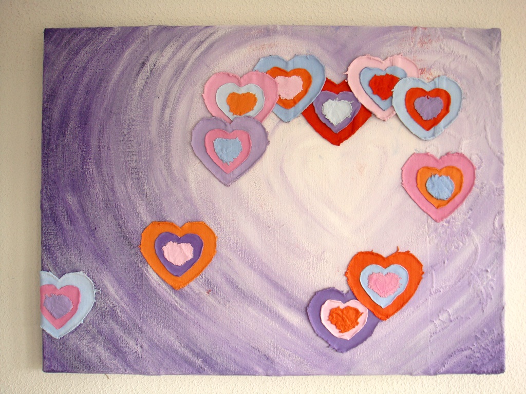 Tijd om de hartjes te bevestigen. Puur op gevoel leg ik ze op de lichtpaarse ondergrond en laat het een paar nachtjes sudderen. Ik schuif en schik nog wat en bevestig dan de harten op elkaar en op het doek.